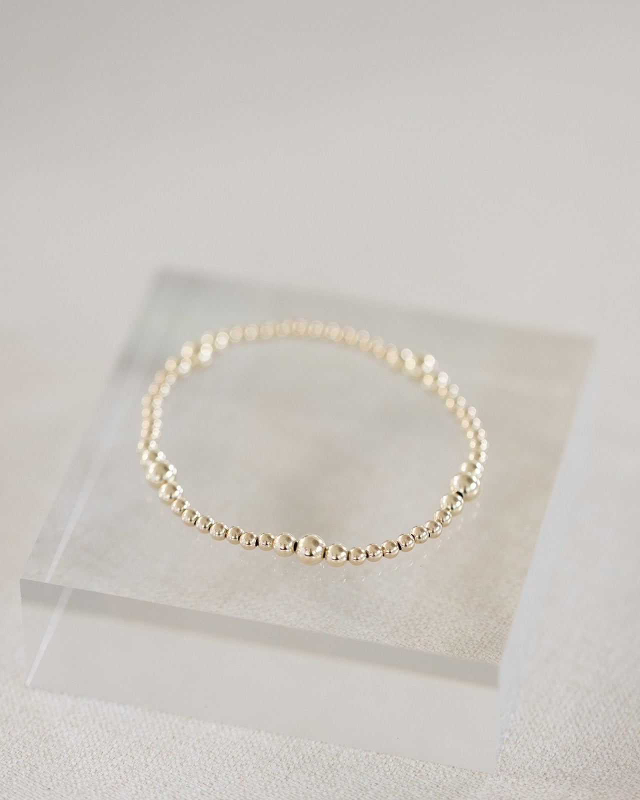 Elevate your everyday jewelry with the Gold Filled Satellite Bracelet. This handmade stretch bracelet features 14k gold filled 3mm, 4mm, and 5mm beads, offering the feel of understated luxury. Whether you're layering it in a gold bracelet stack or wearing it solo, this piece is the perfect addition to your gold jewelry collection.