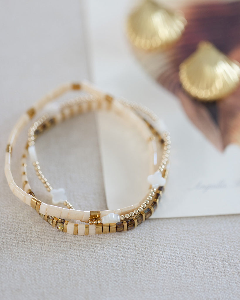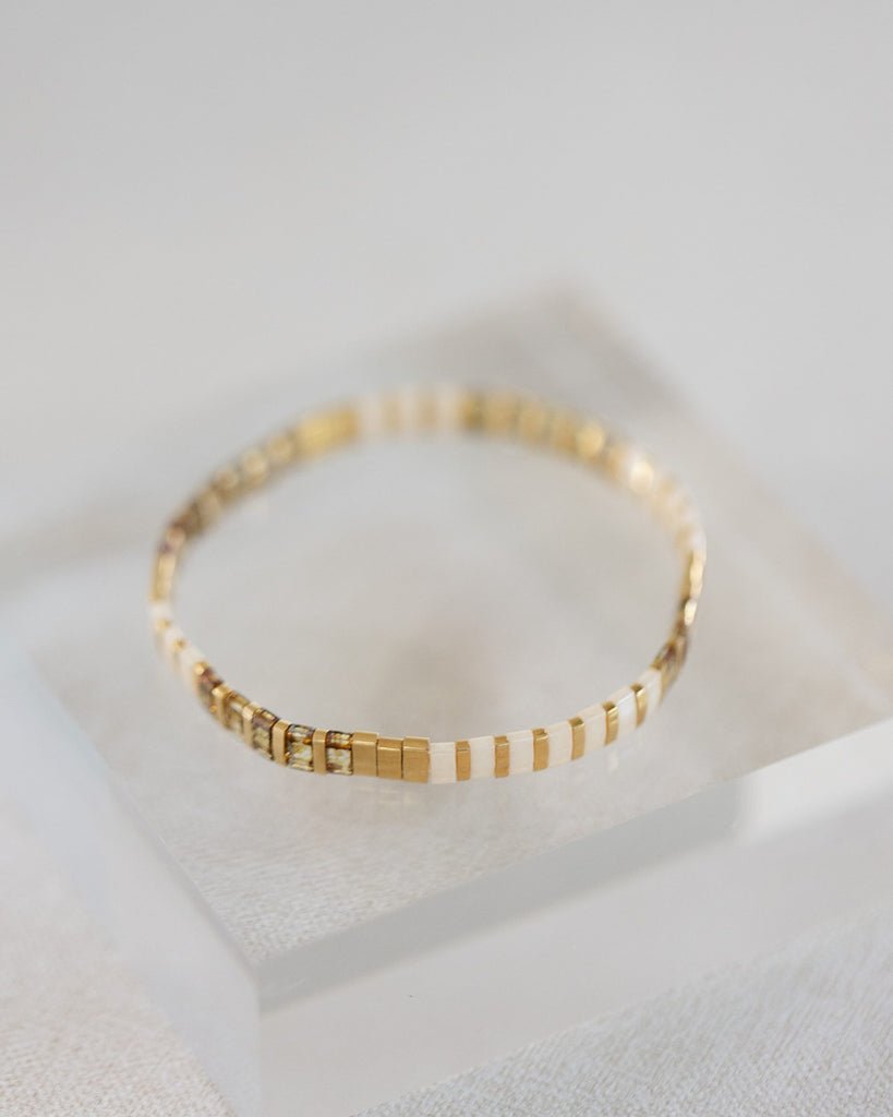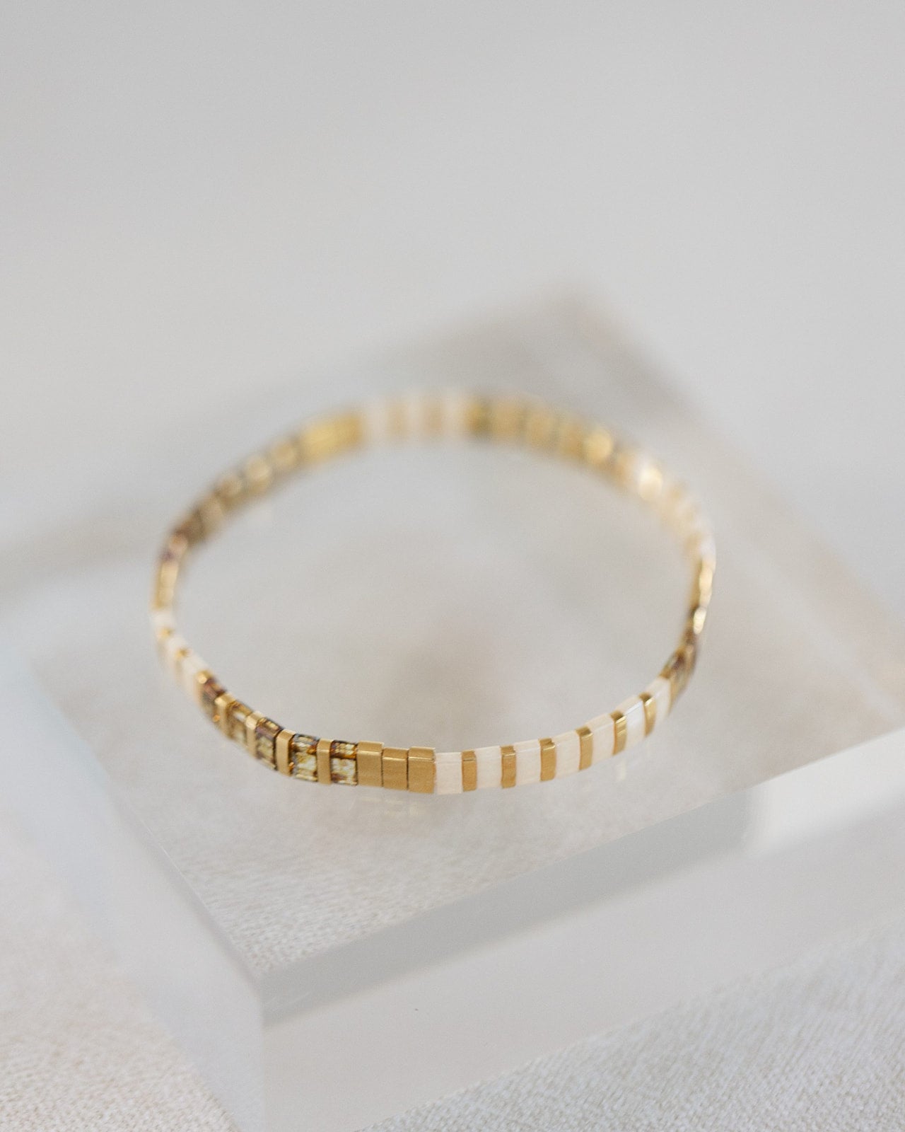Expertly designed and crafted, the Cove Tila Bracelet features a stunning combination of colored and gold Miyuki Tila beads. Handcrafted in the USA by a skilled Coast and Cove Artist, each bracelet is approximately 6.5 inches and designed with a unique pattern that sets it apart from the rest. With a stretch bracelet design, it's easy to wear and perfect for any occasion.
